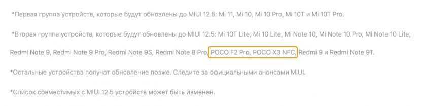 Внимательный читатель спросит: а где же на слайдах сказано про POCO X3 NFC и POCO F2 Pro? Это информация с официального сайта MIUI 12.5. Внизу страницы сказано и о POCO в том числе.