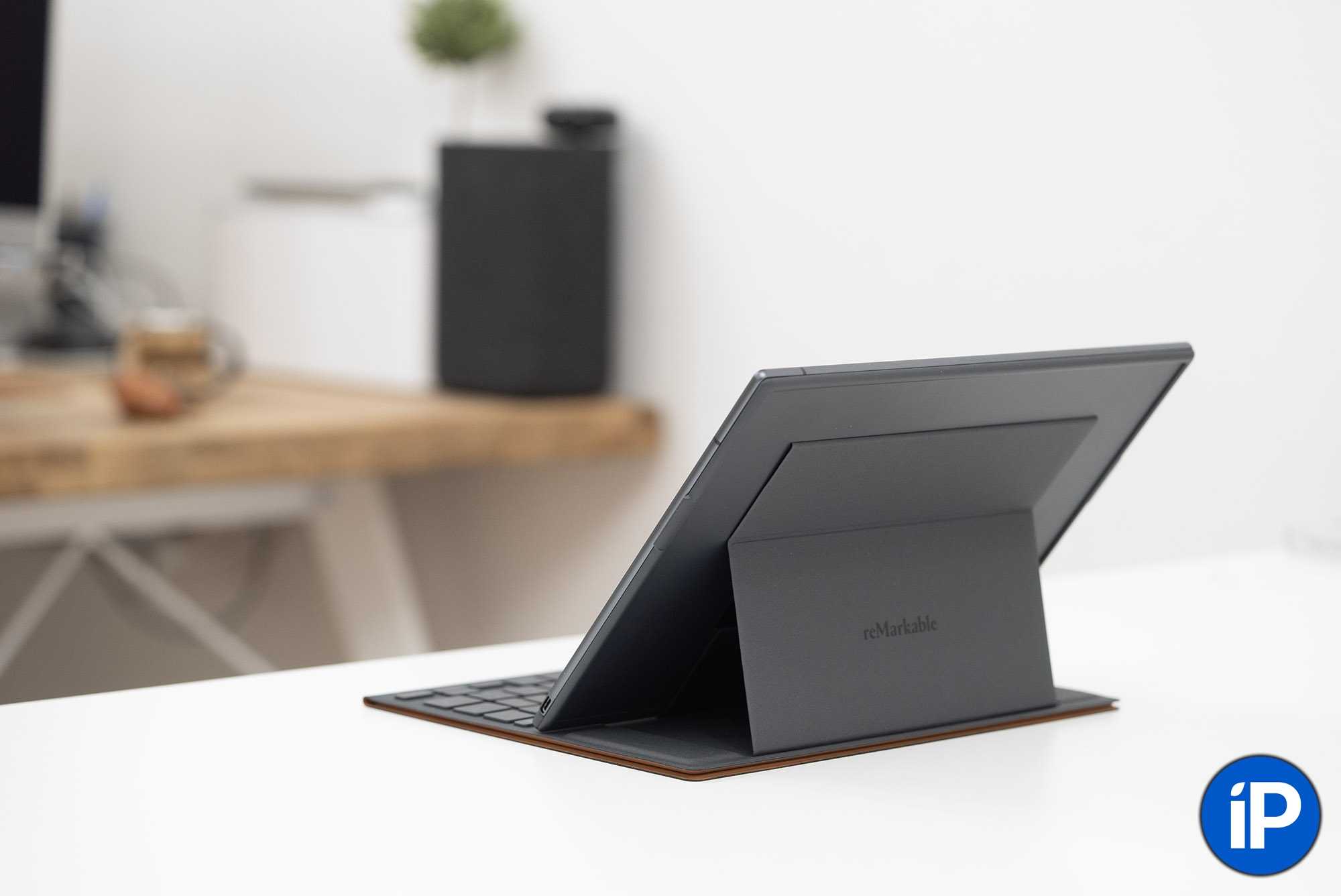 Самый необычный и противоречивый девайс – фирменная док-клавиатура. Внешне он выглядит, как чехол Book Folio и в два движения трансформируется в подставку под reMarkable 2 в горизонтальном положении. Зарядка клавиатуры не требуется, питание на неё подаётся через контактные площадки на металлической рамке планшета.