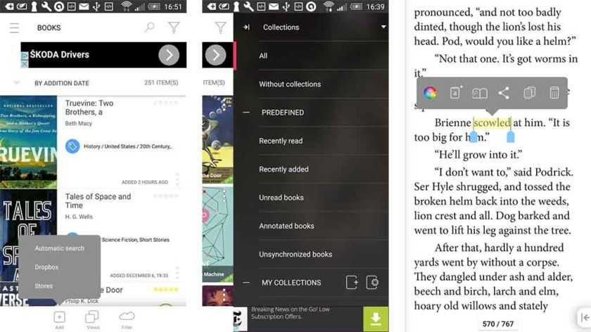 Bookari был когда-то Mantano Reader. Имя изменилось. Тем не менее, приложение по-прежнему является одним из лучших приложений для чтения электронных книг. Он поддерживает синхронизацию между устройствами. Вы также можете купить книги непосредственно у службы. Наконец, он поддерживает множество форматов, включая EPUB2, PDF и другие. Приложение имеет несколько иной набор функций для каждого типа файла. Пользовательский интерфейс немного отличается от того, что мы хотели бы видеть. Однако всё остальное довольно солидно. Бесплатная версия содержит рекламу, в то время как версия 5.49 pro нет.