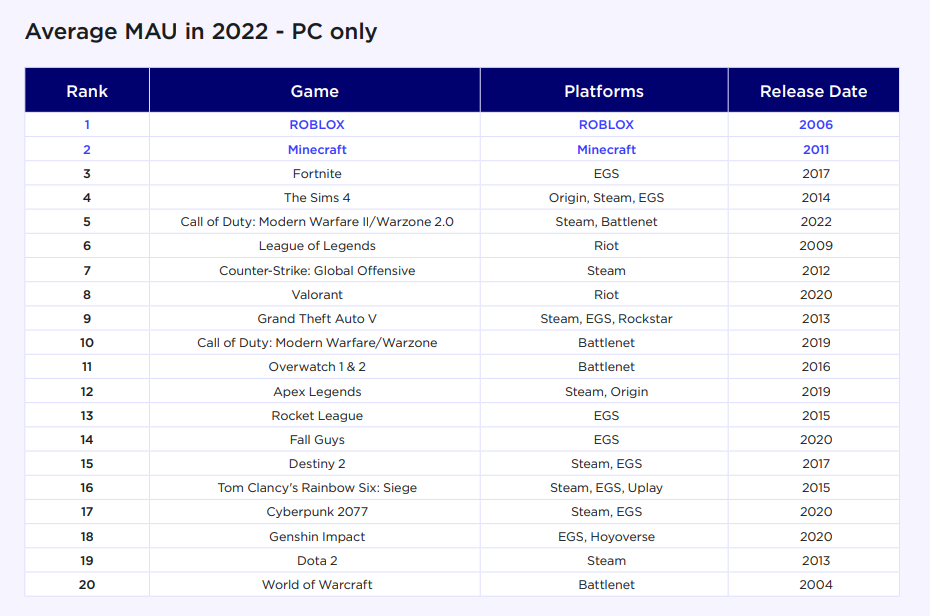 Любопытно выглядит топ-20 игр PC по MAU. В нем первые два места — за Roblox и Minecraft. Кстати, также в десятке можно найти The Sims 4 и Valorant.