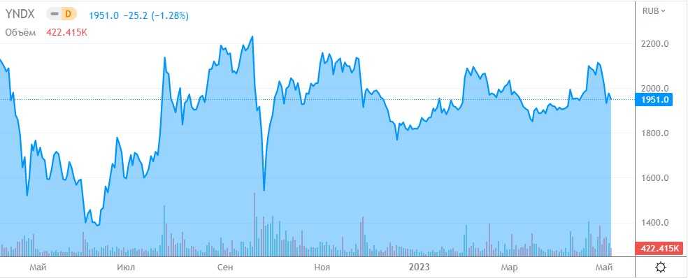 Стоимость акций Яндекса с мая 2022года по май 2023года
