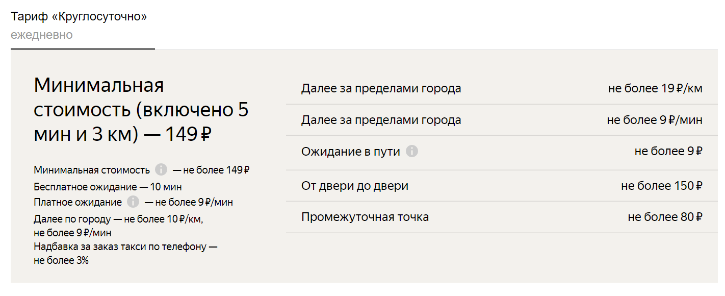 - цена увеличивается в случае превышения лимита минимальной стоимости, при ожидании в точке подачи сверх бесплатного периода или ожидании в пути.