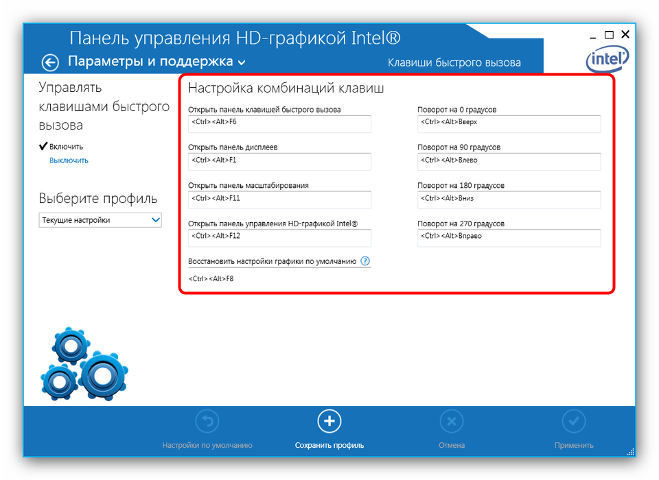В программном обеспечении продуктов Intel имеется возможность создать несколько профилей с графическими настройками компьютера. Переходить от одного к другому можно при помощи «горячих клавиш».