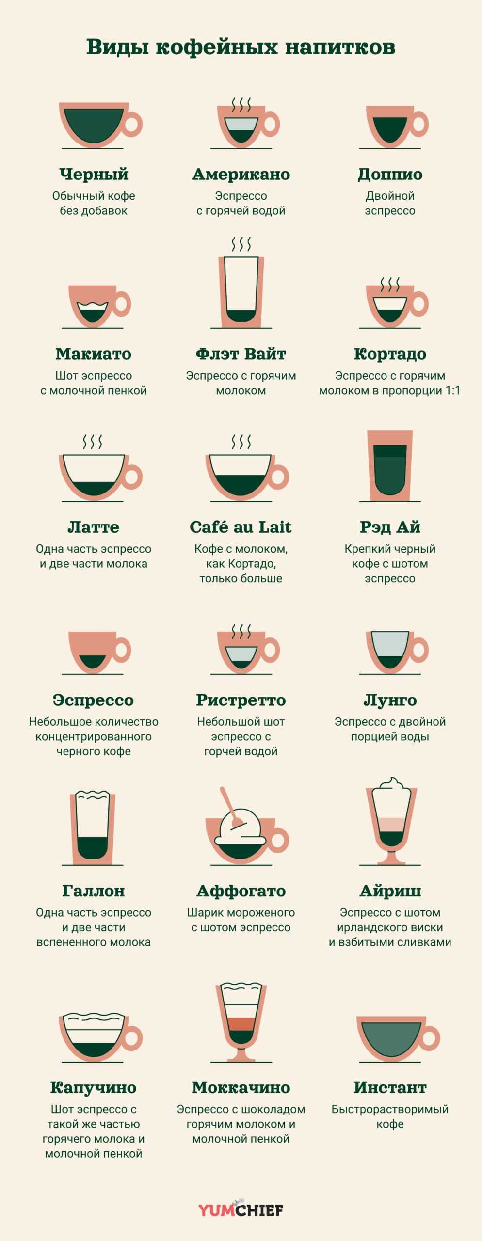 На фото ниже дана краткая наглядная характеристика основных видов кофе по способу приготовления с названием и составом. В Интернете можно найти множество видеорецептов с пояснениями, описанием приспособлений и так далее.