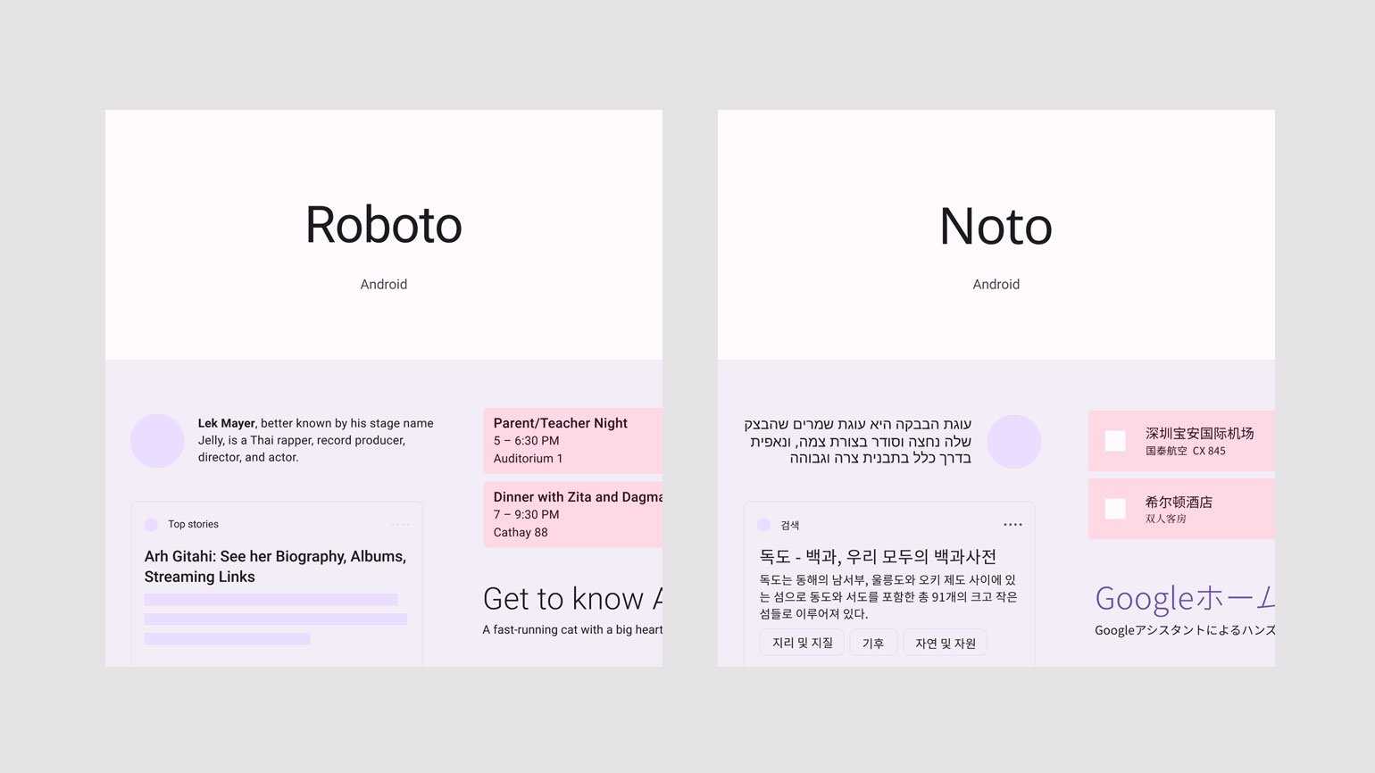 Системный шрифт в Android ― Roboto. Альтернативный ему шрифт ― Noto, он предназначен для тех языков в приложениях Chrome и Android, которые не поддерживают основной шрифт. Google не ограничивает разработчика в использовании шрифта, предлагая собственные рекомендации по выбору гарнитур для заголовков и подписей.
