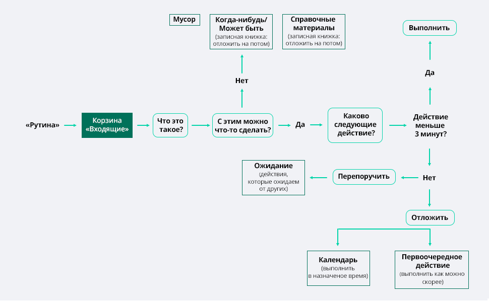 Схема рабочего процесса, организованного по методу GTD, выглядит так: