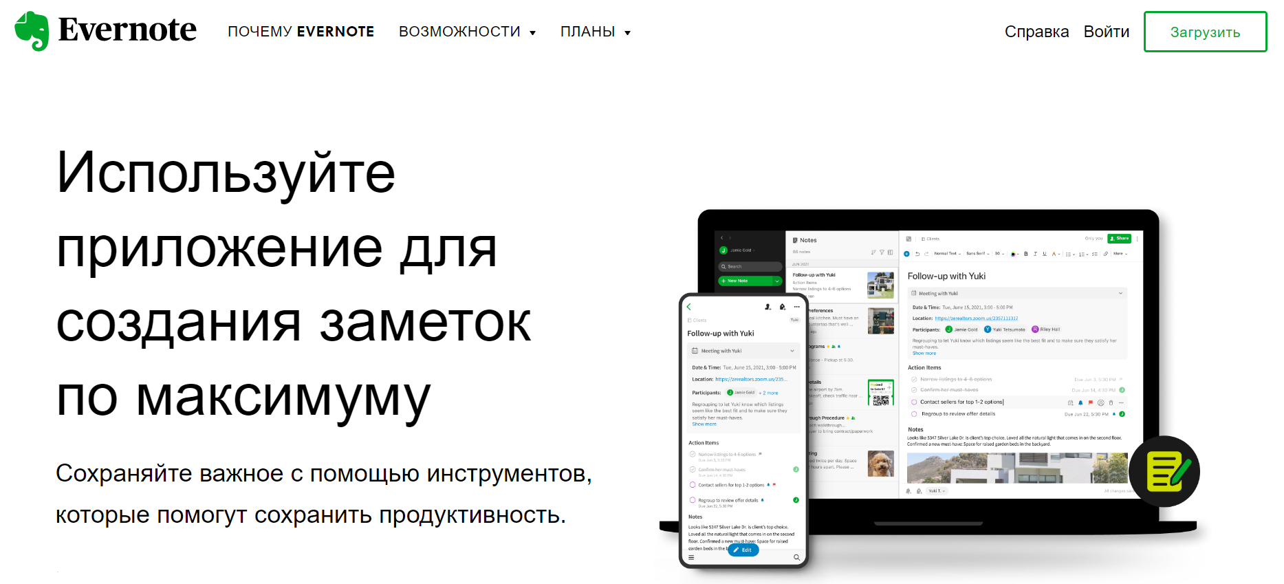 Evernote – приложение предназначено для создания и хранения заметок. Сервис позволяет собрать все проекты в одной системе, быстро фиксировать поступающие задачи и брать их под контроль. Программа доступна как на ПК, так и на мобильном телефоне. Имеет функции создания и распределения задач внутри заметок, настройки сроков и напоминаний, маркировки важных дел флажками.