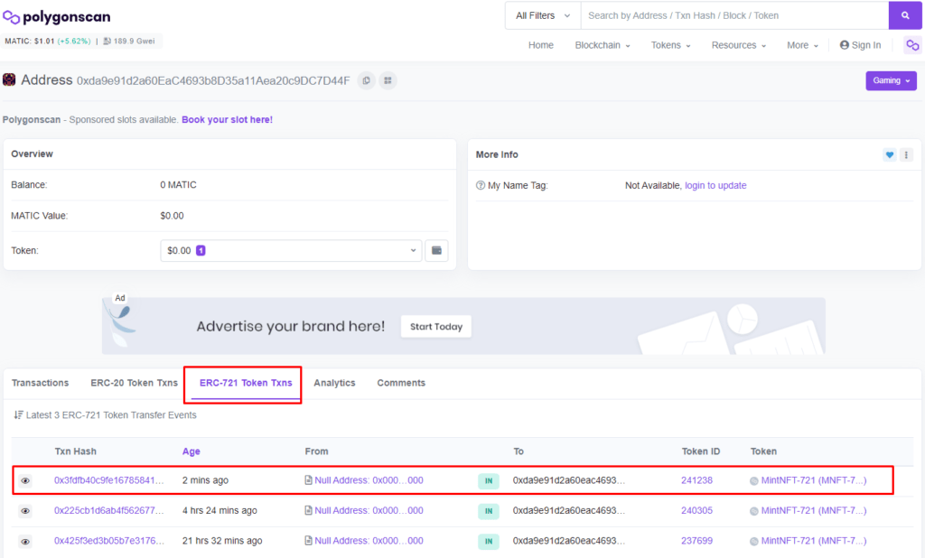 Вы можете посмотреть в polygonscan.com завершённую транзакцию с вашим новым токеном, а также информацию о вашем кошельке, если введёте адрес.