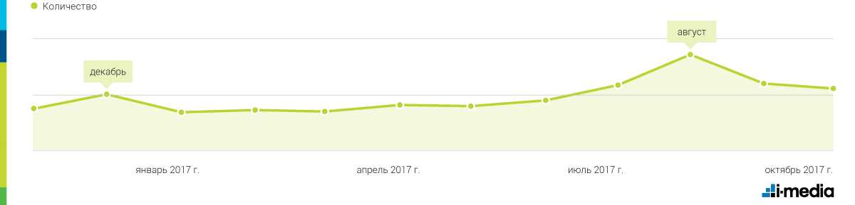 Посмотрим на график показов по запросу «видеокарта купить». Поначалу спрос на видеокарты вполне стабилен: незначительное повышение в декабре и снижение в весенние месяцы, причины которого, скорее всего, аналогичны истории с приставками. Уже в мае мы можем наблюдать увеличение спроса, который сделает невероятный скачок в июне, превысив показатель предыдущего месяца в 2 раза. Тут нет ничего удивительного, ведь начиная с января стремительно рос курс криптовалют, в результате чего летом 2017-го о таком понятии, как майнинг криптовалют, знали и говорили все.