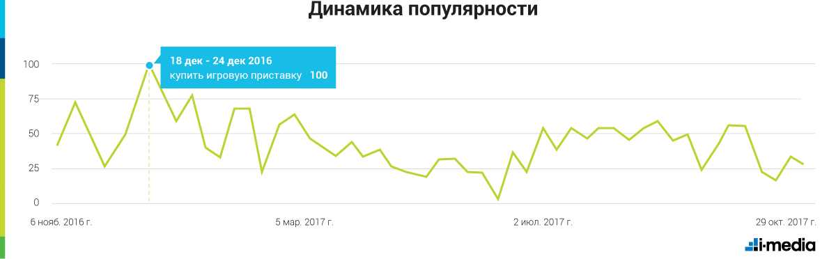 На графике из Google Trends видим, что популярность поискового запроса «купить игровую приставку» в Google выше всего именно зимой, в то время как с наступлением весны она снижается в 2 и более раза. Минимальный показатель зафиксирован в июне.