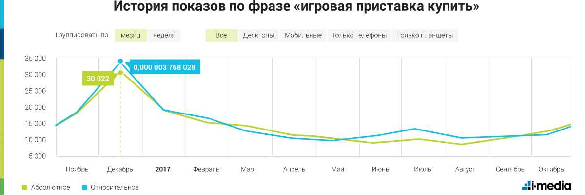 На графике из Яндекс.Вордстата мы видим, что для данной категории товаров характерен повышенный спрос в осенне-зимний период. Самые высокие показатели по показам для запроса «игровая приставка купить» были в октябре, феврале, январе и ноябре. В декабре спрос достигает максимального значения, почти в 3 раза превышая минимальный показатель, который зафиксирован в мае, и в 2 раза – средний уровень за год.