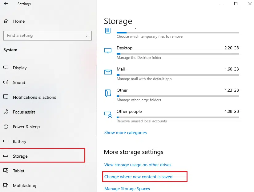 3. Здесь щелкните вкладку Память на левой панели и нажмите Изменить место сохранения нового содержимого.