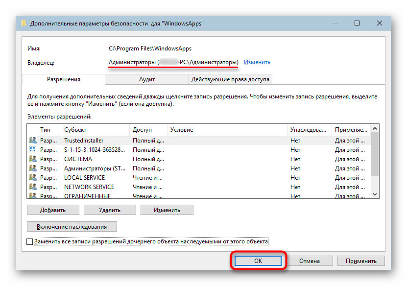 Наконец, вы стали владельцем папки WindowsApps и теперь имеете к ней полный доступ.