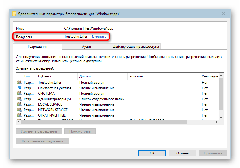 Видим первым списке аккаунт TrustedInstaller. Он имеет полноценные права для доступа к папке WindowsApps. Попробуем изменить владельца, кликнув на активную ссылку «Изменить»