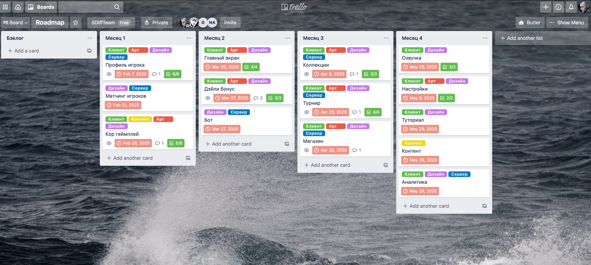 Следующий шаг — написание роадмапа. Для этого в Trello составляю список механик, которые необходимо реализовать. Внутри каждой механики грубо указываю подзадачи (для примерного понимания времени разработки) и отмечаю кто из команды будет работать над данной механикой. Получается вот такое описание: