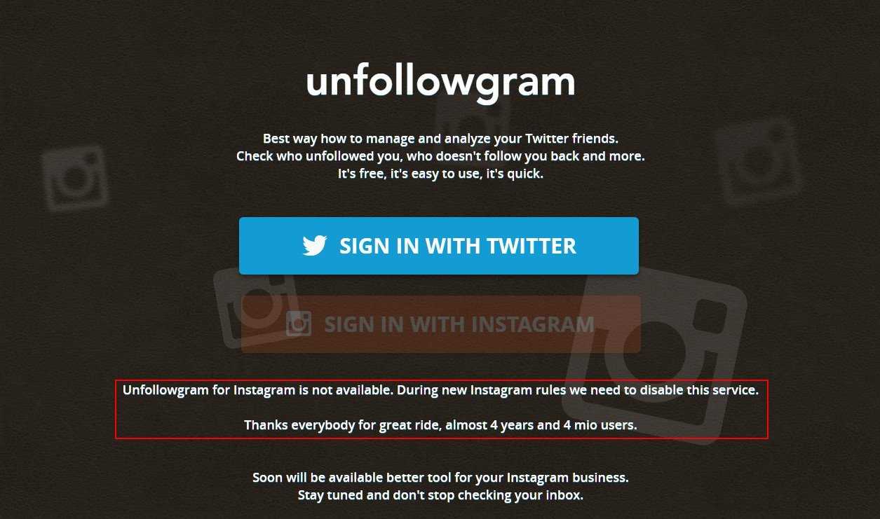 Можно ли узнать кто отписался в инстаграме? Еще совсем недавно существовало множество сайтов, которые позволяли узнать онлайн, кто отписался, прямо с компьютера. Но из-за нововведений Инстаграма большинство таких сайтов или прекратили свою работу или переквалифицировались, например, в сервисы автопостинга. Это случилось с популярным unfollowgram.com, который прямо заявляет на своем сайте, что прежний функционал теперь недоступен.