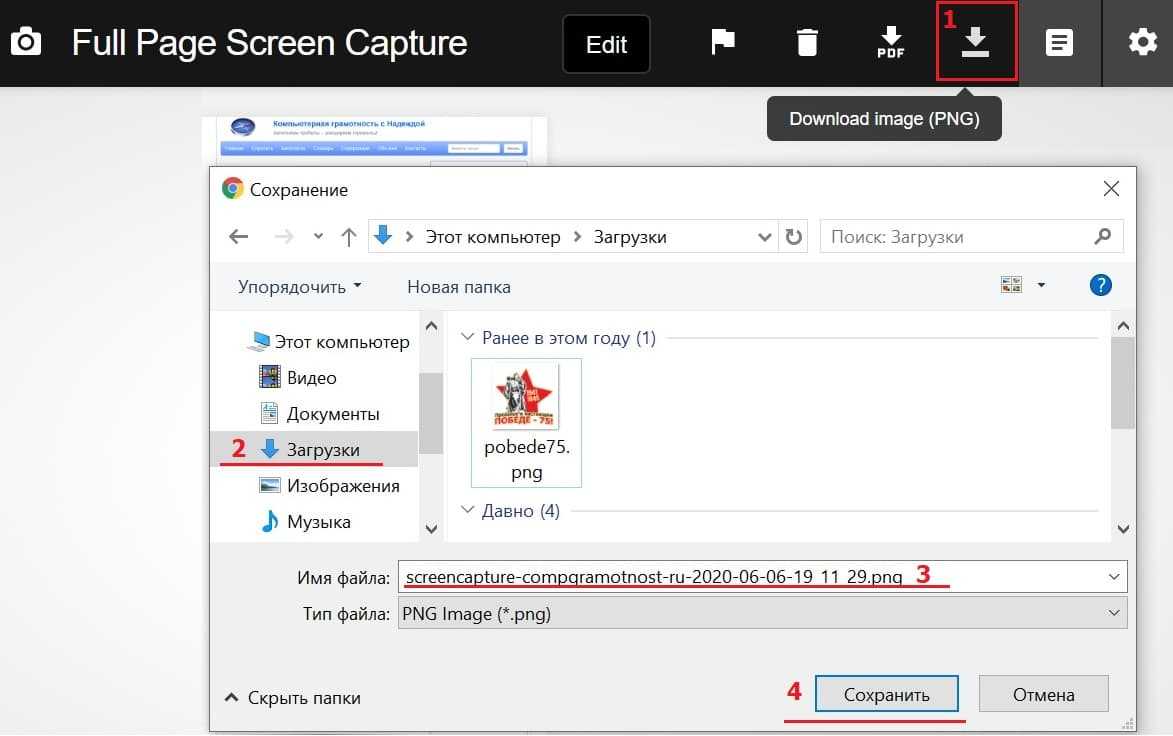 Цифра 1 на рис. 2 – Кнопка в виде стрелки вниз – Download Image (PNG) для того, чтобы скачать скриншот как рисунок с расширением png. Это означает, что редактировать такой файл можно с помощью любого графического редактора: стандартного Paint, Фотошоп или другого.