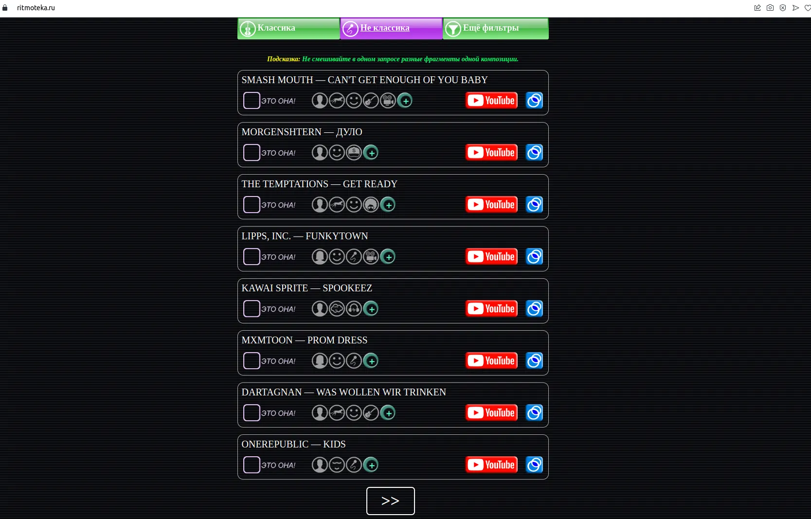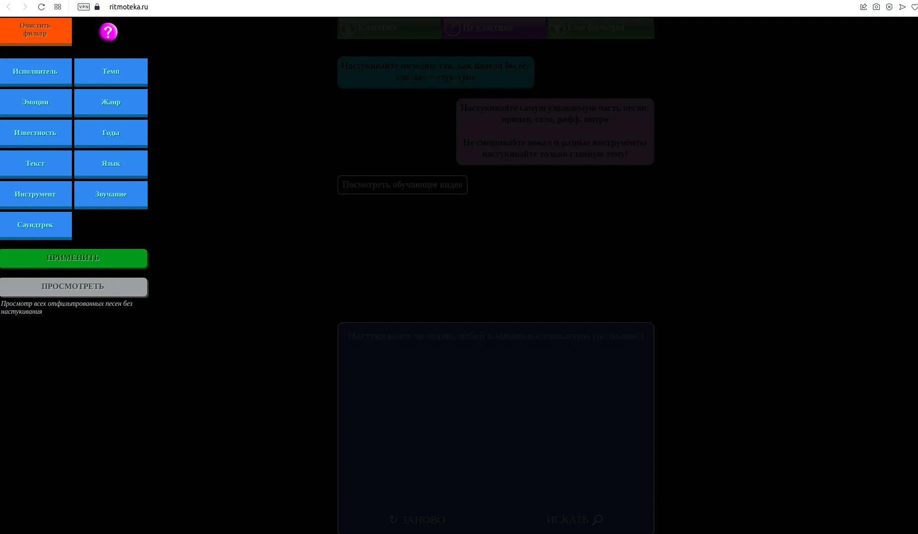 Для наглядности лично попробуем найти песню на Ритмотеке, используя как можно меньше вспомогательных настроек.