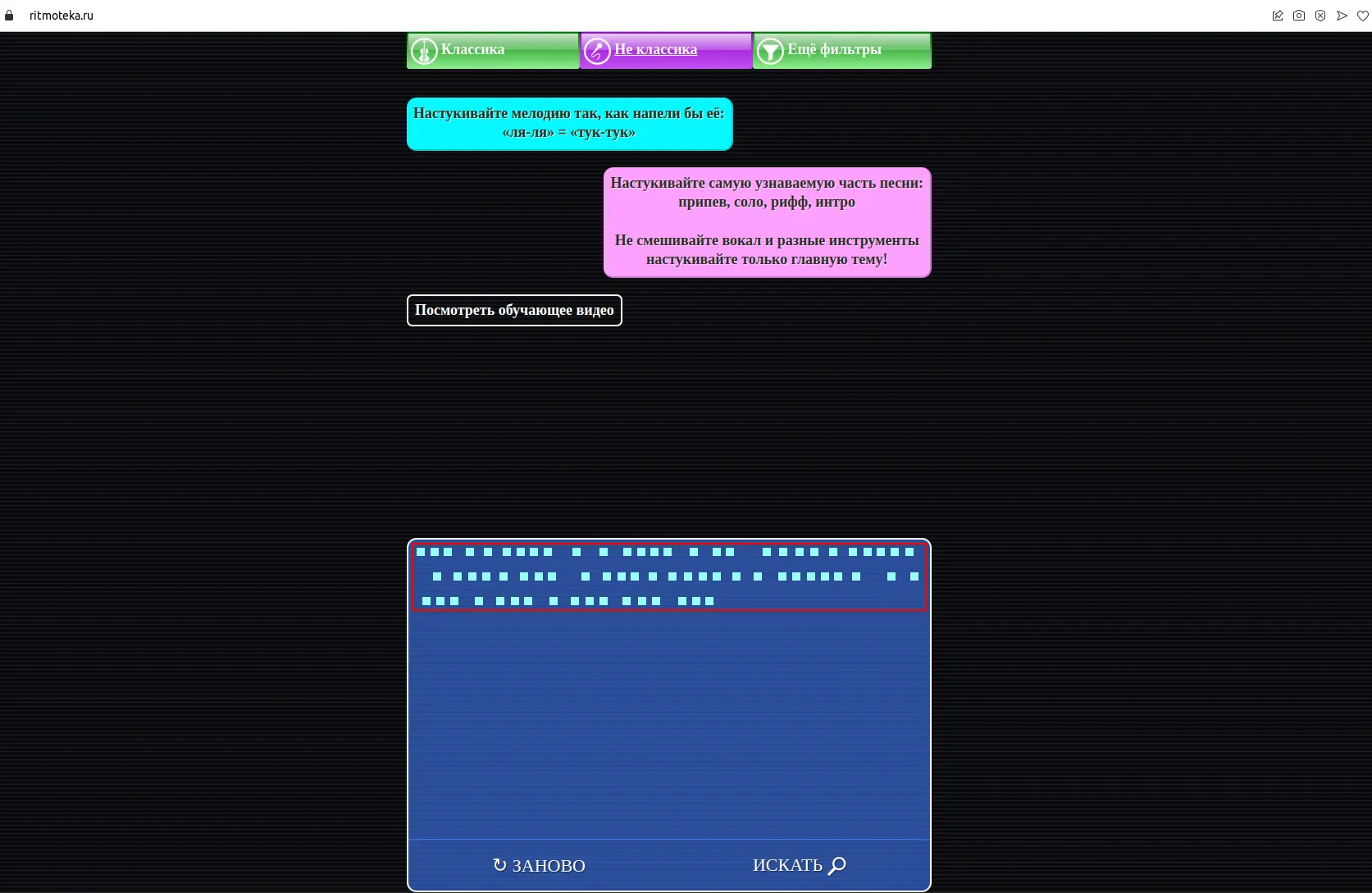 После этого необходимо выбрать раздел музыки, которую нужно найти: классическую или неклассическую. Для поиска классической музыки настраивать дополнительные фильтры не нужно. Открытие окна голубого цвета – это прямой сигнал начинать настукивать мелодию. Каждый удар будет обозначаться красным квадратиком. Чем больше ударов, тем больше квадратиков. Окончательная версия ритма песни будет выглядеть примерно так: