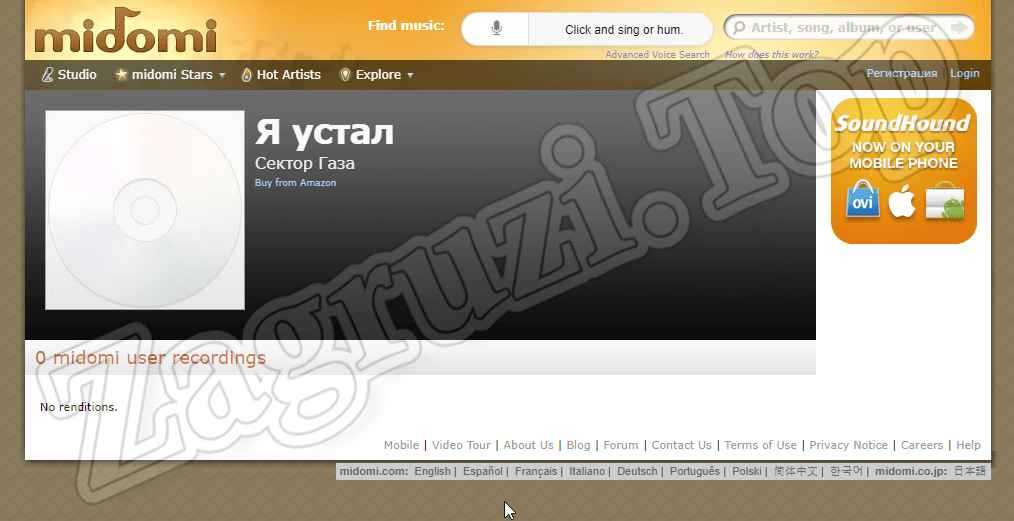 Вам нужно просто нажать на кнопку и поставить свой микрофон к источнику звуку или напеть нужную вам песню. Помимо прочего, на ресурсе вы сможете получить доступ к различному контенту музыкальной направленности. Также вы можете воспользоваться функциональным поисковиком. Пожалуй, спросив пользователей о каком-нибудь распознавателе музыки, один из трех порекомендует вам заглянуть к Midomi.