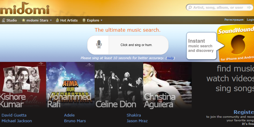 Midomi – это еще один чрезвычайно популярный сервис, способный определять песню по звуку. Довольно интересный факт: Midomi – это дочерняя компания SoundHound. Данный сервис работает примерно по такой же схеме, как и предыдущий сервис в списке, тем не менее вам не потребуется загружать на него какие-либо аудиофайлы.