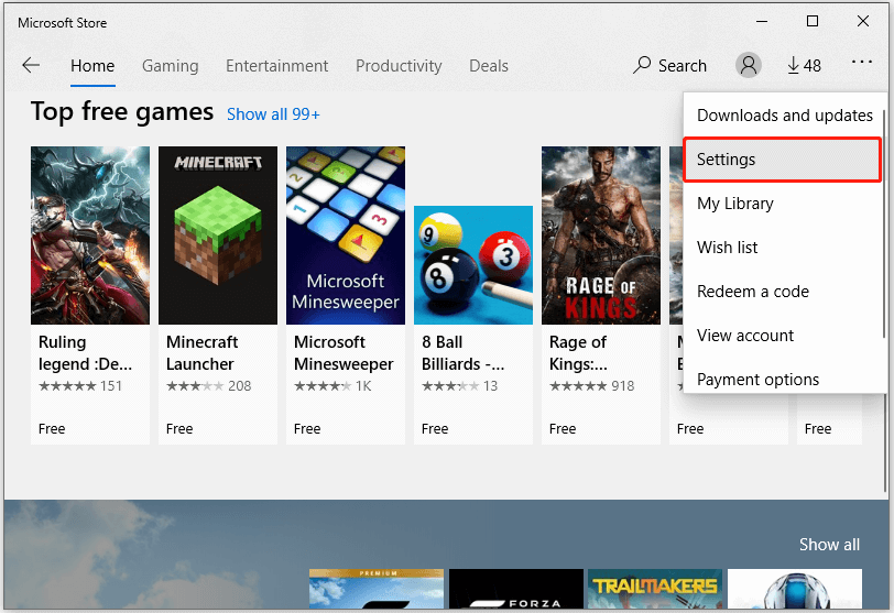 Step 3: When you get the main interface of Microsoft Store, click the three-dot icon located at the upper right corner and select Settings.
