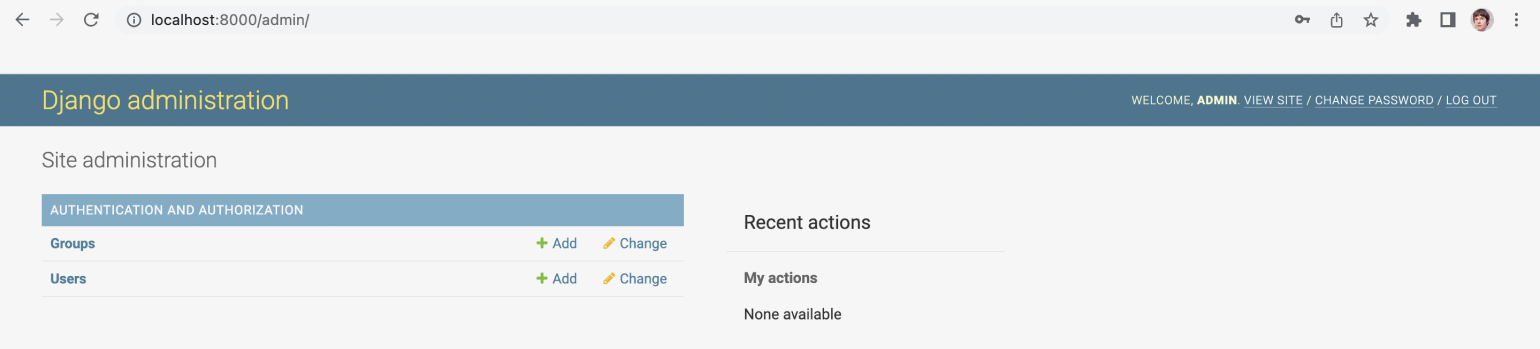 Завершим настройку нашего проекта и перейдём на страницу администрирования http://localhost:8000/admin. В форме введём имя и пароль суперпользователя, которые мы задали в предыдущем пункте. В результате нам откроется панель администратора: