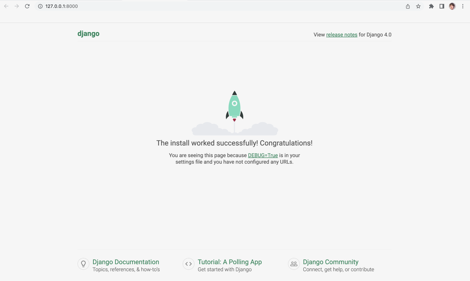 Когда сервер запущен, вы можете открыть проект Django в браузере, введя http://127.0.0.1:8000 или http://localhost:8000. Если все предыдущие этапы выполнены правильно, вы увидите приветственное окно Django: