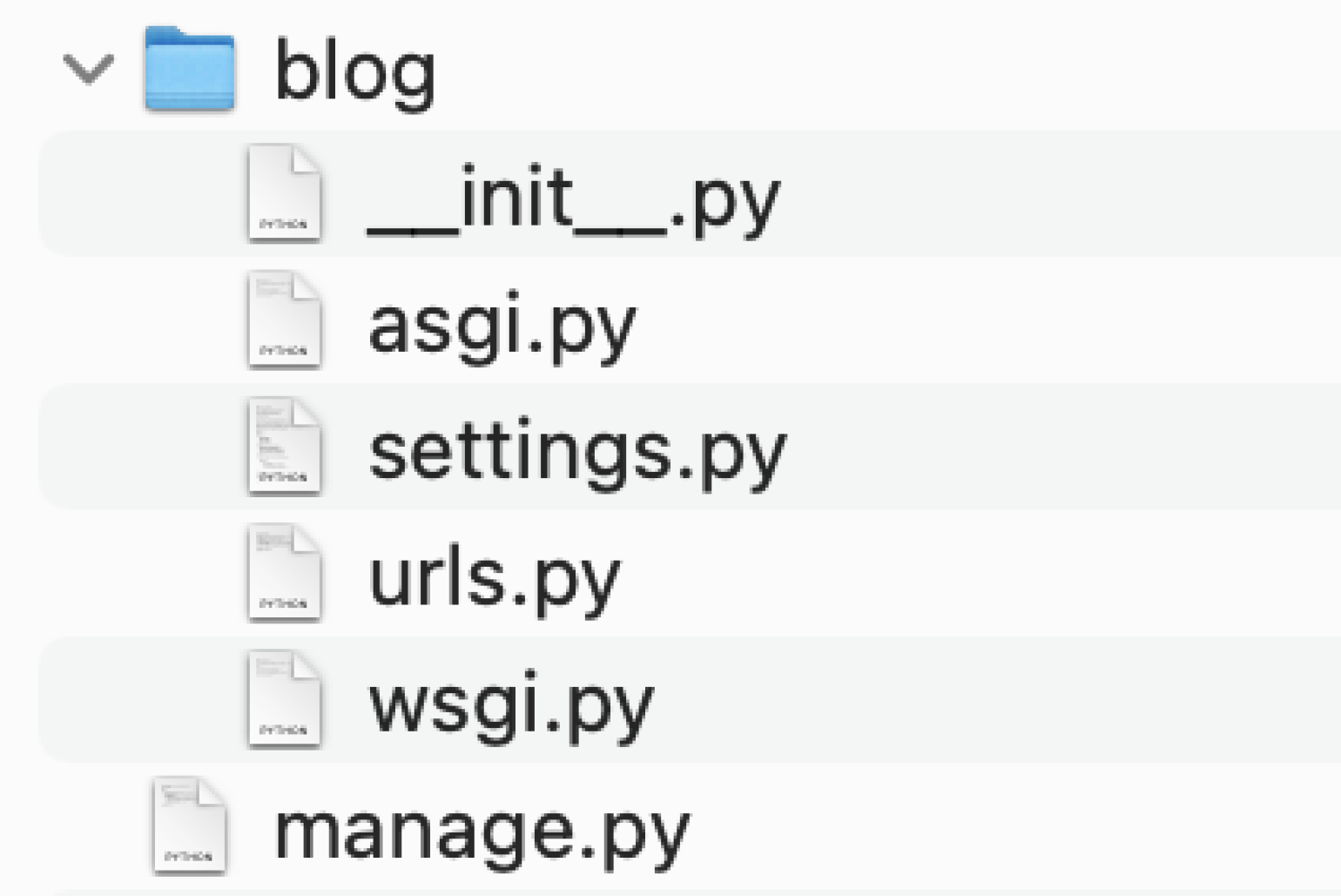 Если всё прошло хорошо, то Django создаст в нашей директории blog файл manage.py, управляющий выполнением всех задач в терминале, и папку blog с пятью файлами: