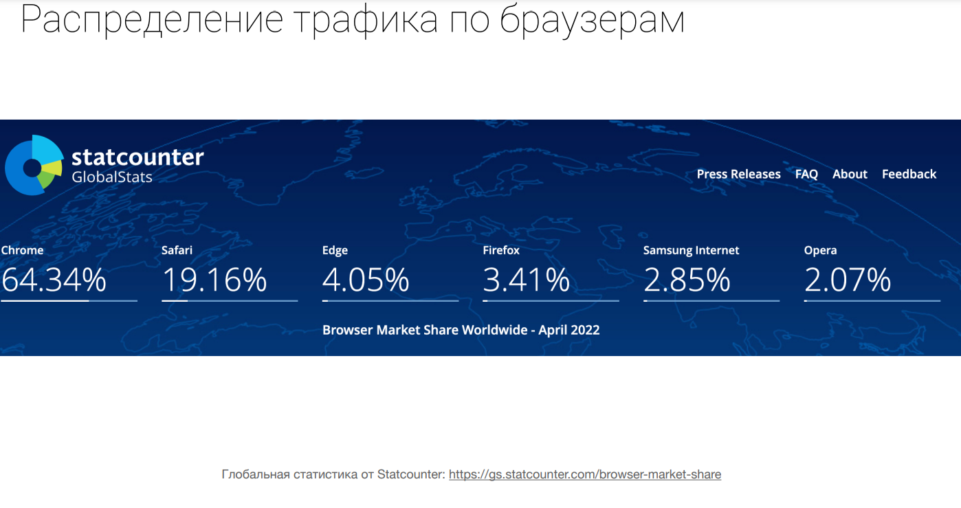 Через Google Chrome проходит 65% общемирового трафика, на втором месте Safari с 19%, другие браузеры – от 2% до 5%.