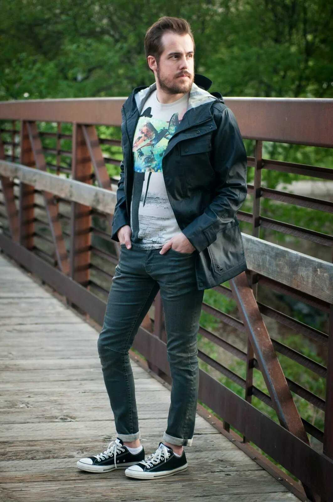 - Мужчины сочетают кроссовки со спортивной одеждой: штанами, лосинами, толстовками, майками. Цветные модели гармонируют со свитерами, украшенными яркими принтами. Эффектно выглядит обувь вместе со стрейч-брюками и традиционными пальто.