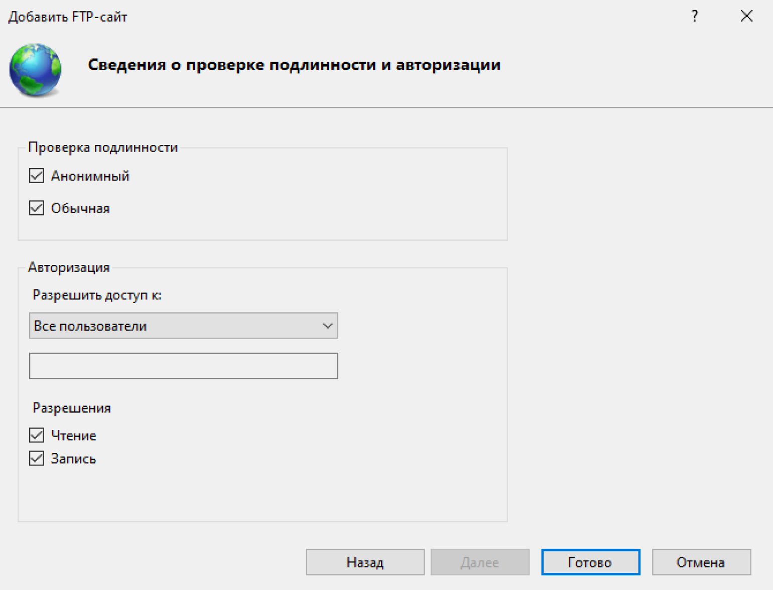 В последнем окне с настройками нужно выбрать, каких пользователей пускать на сервер, и выдать им разрешения. Поставим галочки для анонимных и обычных пользователей, а ниже укажем, что они смогут читать и записывать данные: