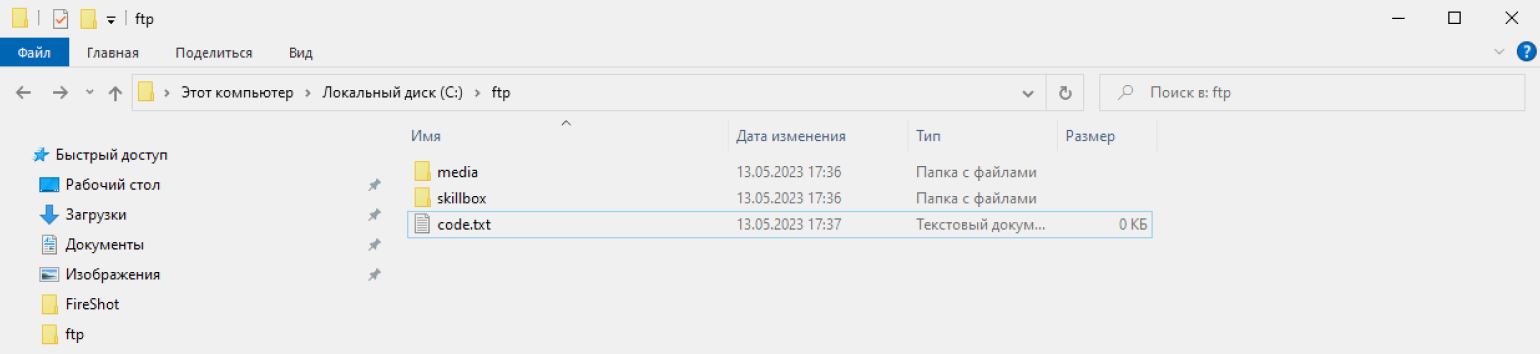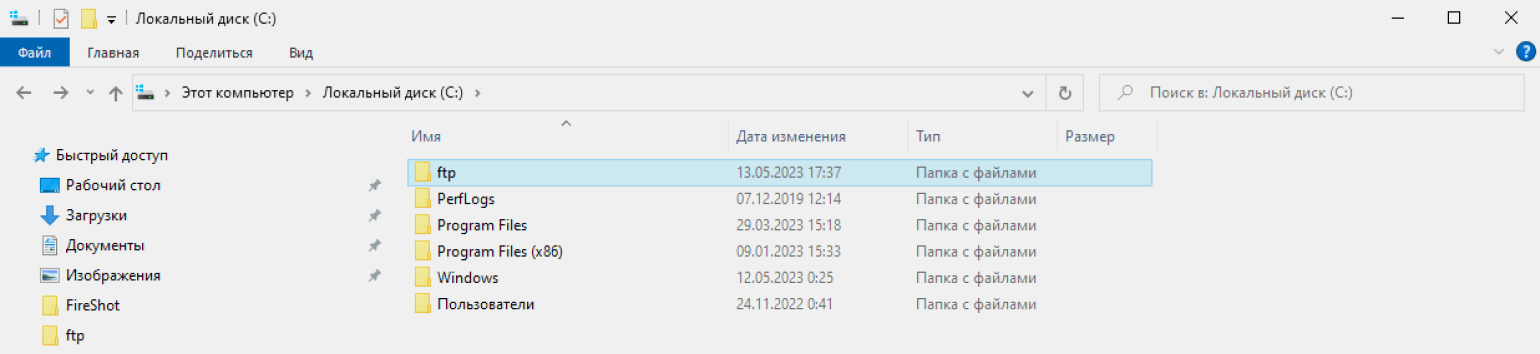 Чтобы использовать сервер, нам понадобится папка, в которой мы будем хранить все файлы. Создадим её на диске C и назовём ftp:
