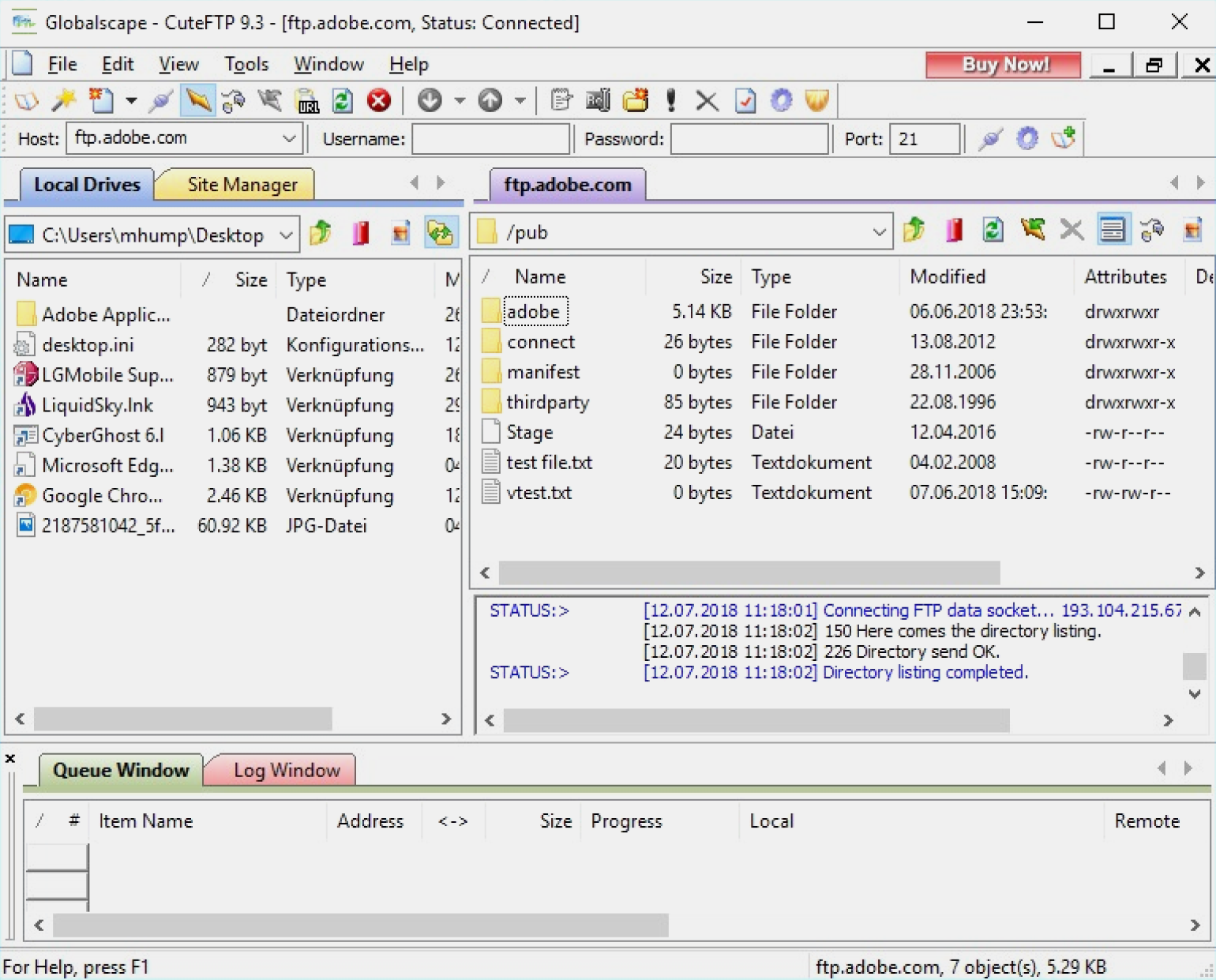 Управление CuteFTP почти не отличается от FileZilla. Чтобы перекинуть файл с одного компьютера на другой, нужно перетащить его из левого окна в правое. А если вы хотите зашифровать передачу, CuteFTP поддерживает сертификаты SSL и TLS.