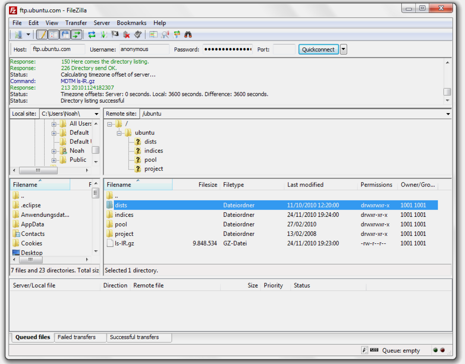 Downloading files, or complete directories, works essentially the same way as uploading — you just drag the files/directories from the remote pane to the local pane this time, instead of the other way round.