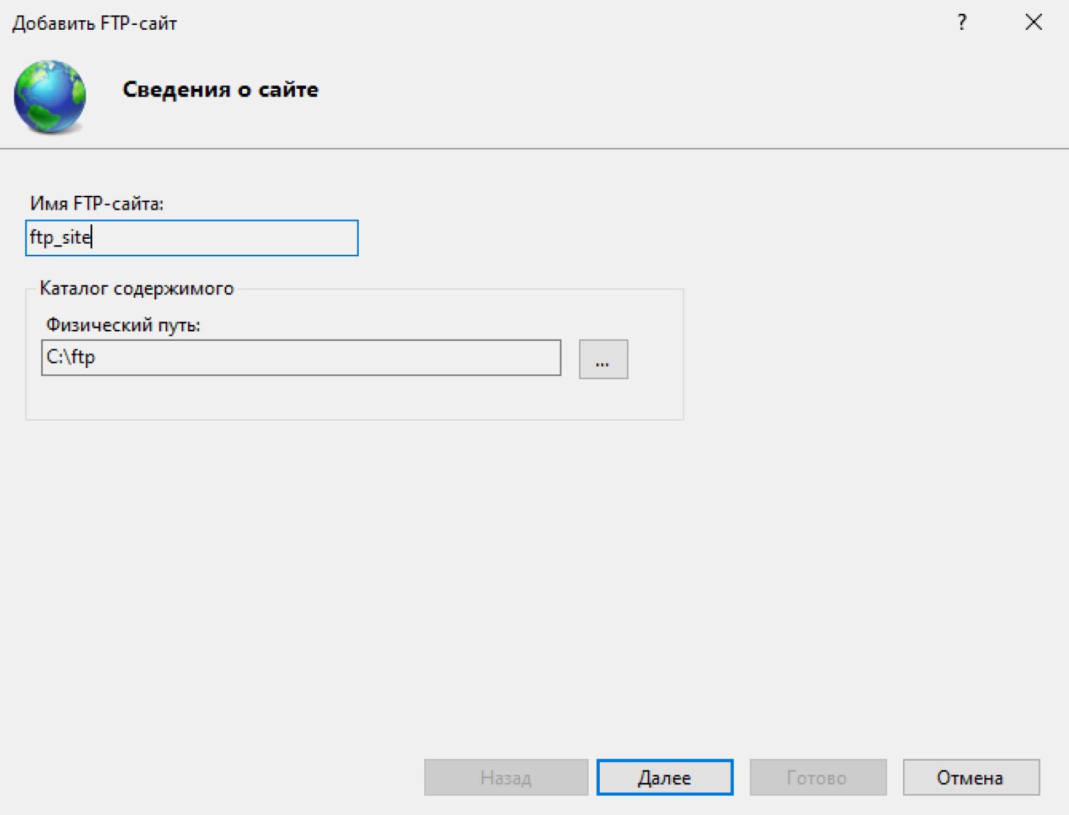Теперь нам нужно указать данные нашего сервера. В поле Имя FTP-сайта вписываем любое имя, какое захотите, а во вкладке Физический путь указываем путь до нашей папки ftp. Жмём Далее: