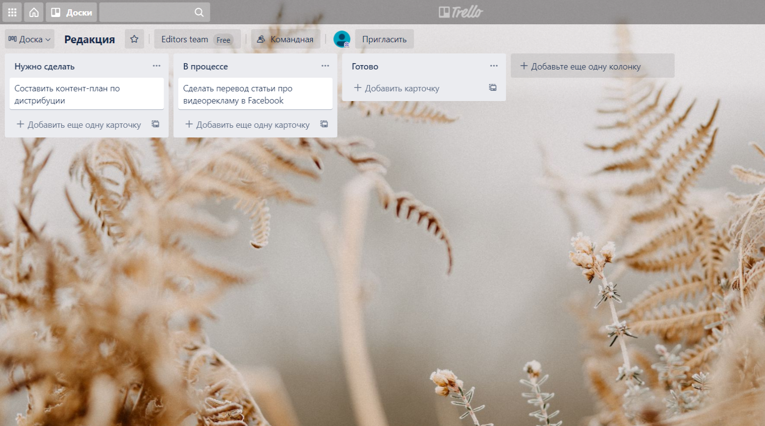 Программа для командной работы над проектами по системе Kanban. Интерфейс приложения имеет вид виртуальной доски с карточками, сгруппированными в несколько колонок, соответствующих статусу задачи. В карточки можно добавлять описания, прикреплять теги, чек-листы, закреплять исполнителей для выполнения задач. Карточки фильтруются по цветам или другим меткам. Сервис подходит для небольших команд. В Trello можно несколько проектов разместить на одной доске или использовать для каждого отдельную доску.