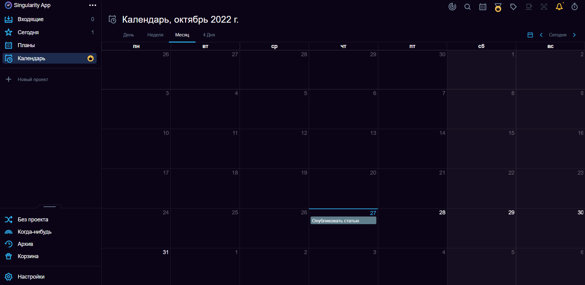 У SingularityApp минималистичный дизайн, а в кабинете есть несколько основных вкладок с задачами. Во «Входящих» собраны новые задачи, во вкладке «Сегодня» — задачи, запланированные на день. Во вкладке «Планы» находится расписание с задачами на каждый день, а в «Проектах» — глобальные цели, состоящие из нескольких задач. К ним можно написать описание, добавить теги и создать подпроекты. Во вкладках «Без проекта» и «Когда-нибудь» собраны задачи без тега проекта и без даты назначения.