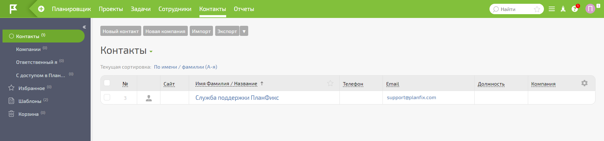 Контакты. Сюда можно записать контакты отдельных сотрудников, подразделений компании, клиентов и т. д.