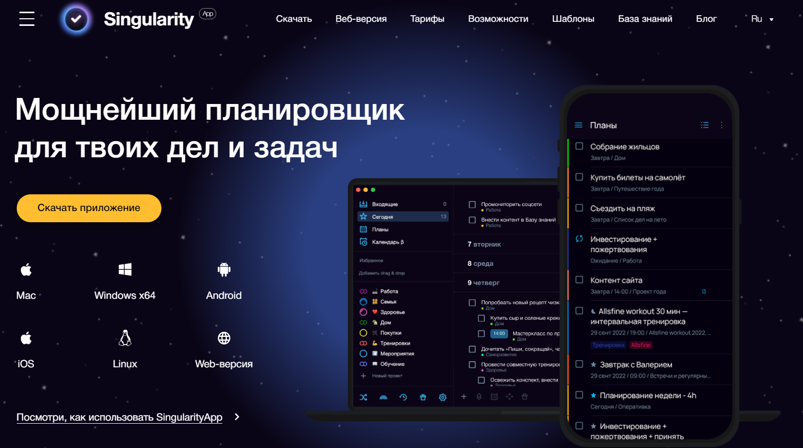 SingularityApp — планировщик задач, который помогает организовать повседневные задачи в структурированный список. Сервисом можно управлять с десктопного приложения или с мобильного, а также в браузере.