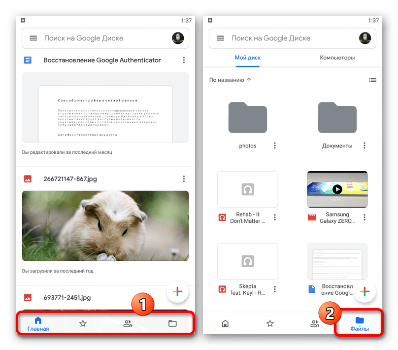 - Откройте приложение Google Drive и с помощью панели в нижней части экрана откройте вкладку «Файлы».