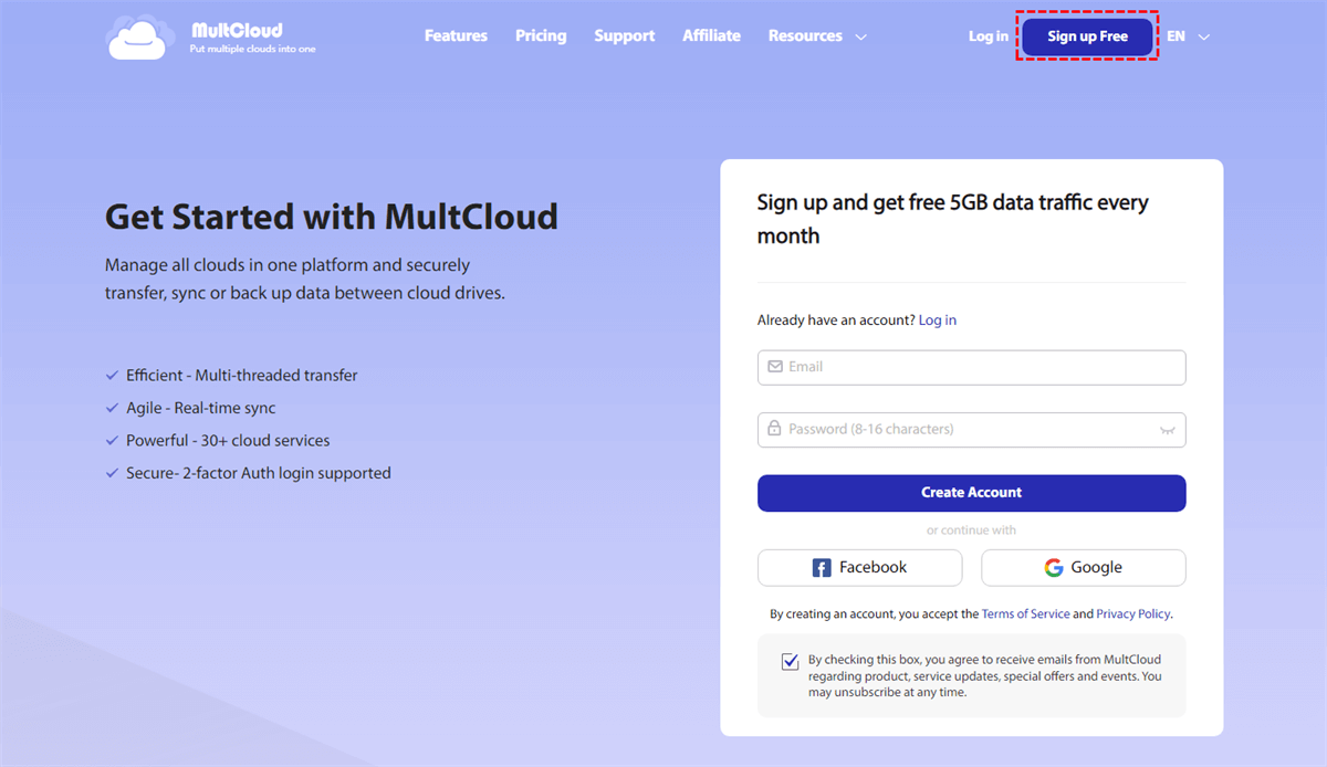 Step 1. Register MultCloud for free. As an online program, to take advantage of its features, we just need to create an account. What’s more, registration is completely free!