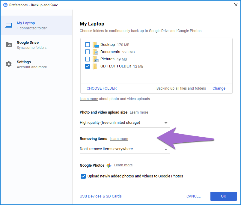 К счастью, Google предлагает две дополнительные настройки, которые будут препятствовать удалению файлов отовсюду. Для этого перейдите в «Настройки резервного копирования и синхронизации», а затем на свой компьютер / ноутбук. Здесь вы найдете настройки удаления элементов. Нажмите на него, чтобы открыть две другие опции: не удаляйте предметы повсюду и спросите меня, прежде чем убирать предметы повсюду.