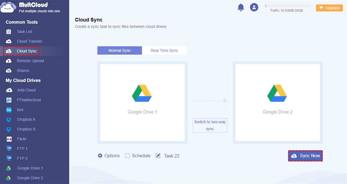 For sync operation between local devices and Google Drive, Google’s official application can help you very well. But if you need to sync Google Drive to another account or cloud drive, you need to rely on other third-party tools, such as the professional and reliable multiple cloud sync software – MultCloud.