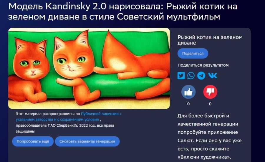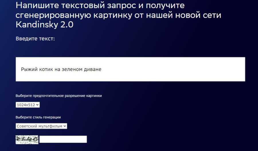 Специалисты из SberDevices и Sber AI рекомендуют поочередно воспользоваться каждым из представленных проектов для знакомства с современными технологиями, но редакция блога Сергея Смирнова ограничится лишь разделом Kandinsky 2.0. Цель – нарисовать рыжего котика на зеленом диване в стилистике советского мультфильма с разрешением в 1024×512 пикселей.