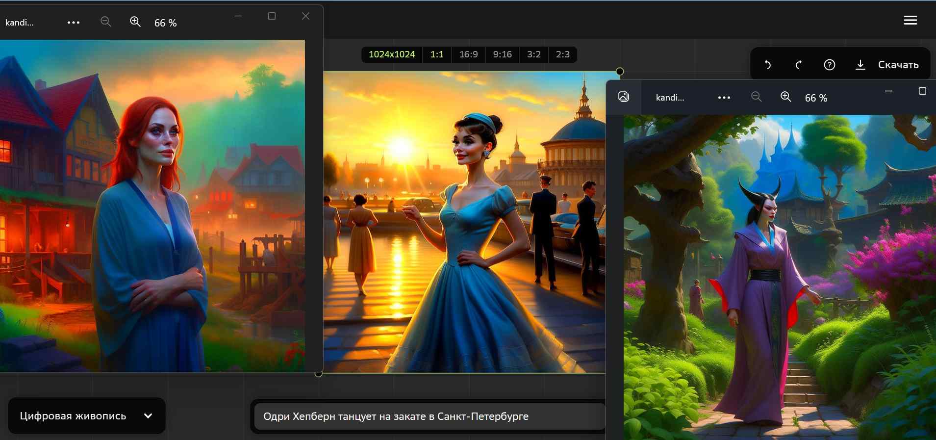 Для Kandinsky 2.2 мы использовали следующие промпты1. «Женщина, 25 лет, похожая на Джулианну Мур, на фоне деревни с деревянными домами, туман, поздний вечер».2. «Одри Хепбёрн танцует на закате в Санкт-Петербурге».3. «Малефисента в розовом платье гуляет по японскому саду»
