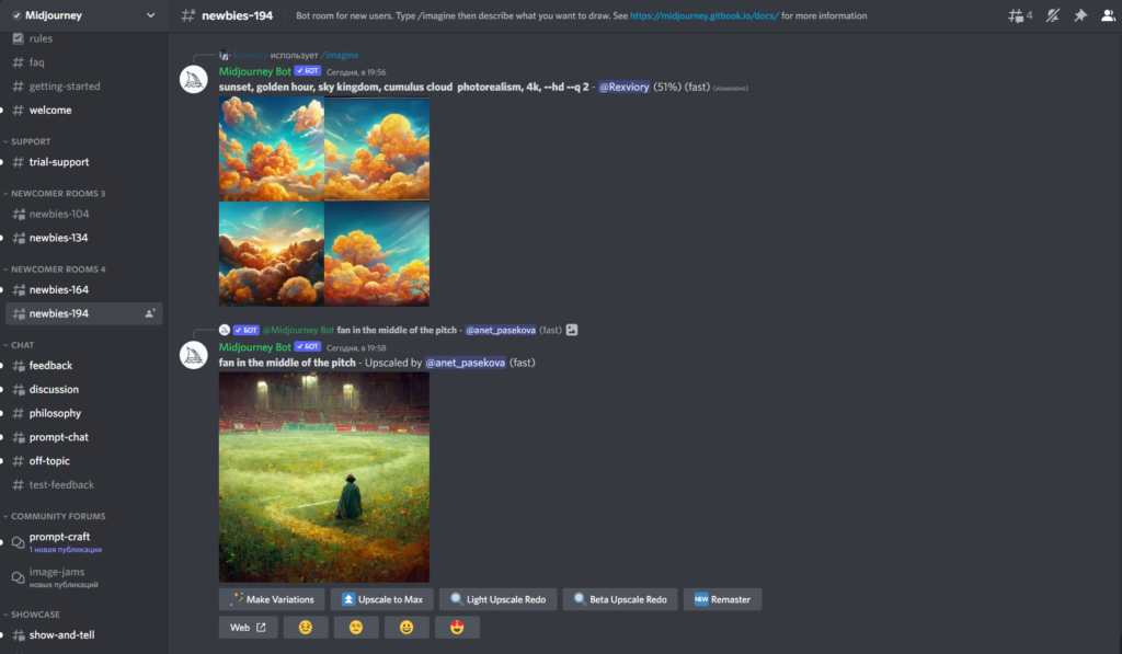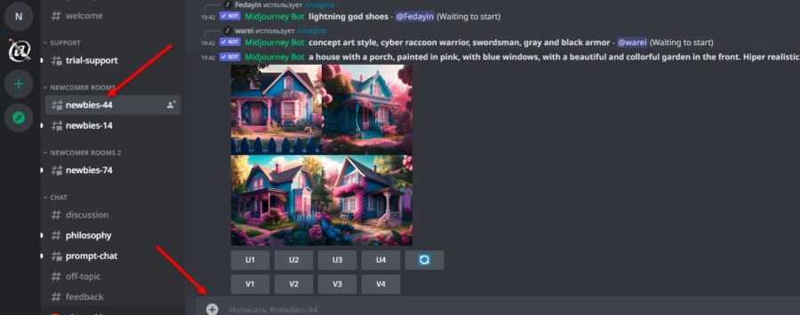 Теперь переходим к тестированию Midjourney. Выбираем один из каналов , и любые другие с подобными названиями. Перейдя в них, вы окажетесь в общем чате, куда загружаются сгенерированные другими людьми картинки.