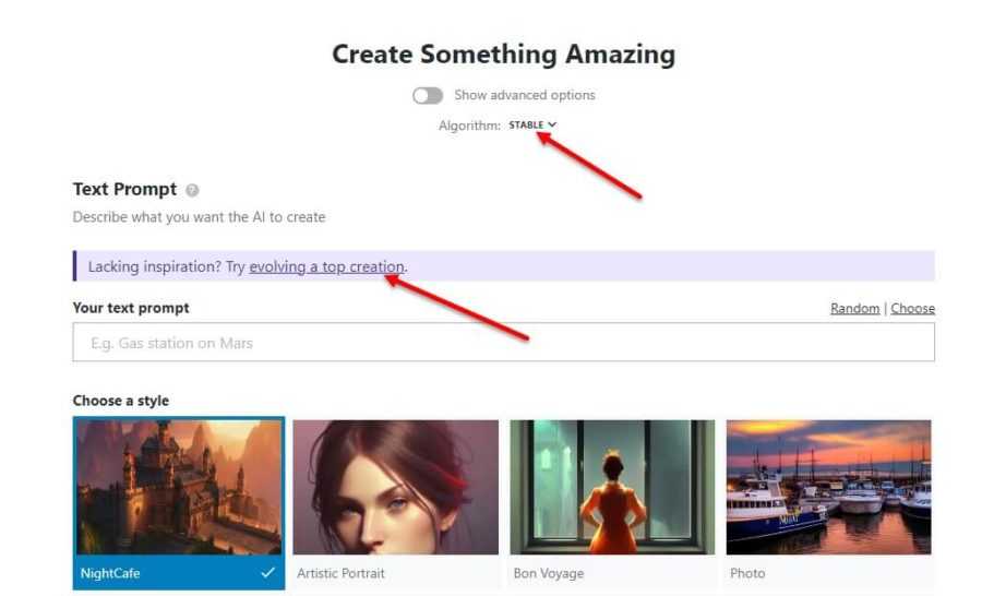 Кроме стилей, Night Cafe не мешает выбирать еще и алгоритмы распознавания текста и генерации нового контента. С момента запуска нейросети в редакторе появилась поддержка Stable, DALL-E 2, Coherent и Artistic. Но со временем разработчики обещают добавить и иные техники подготовки иллюстраций из слов.