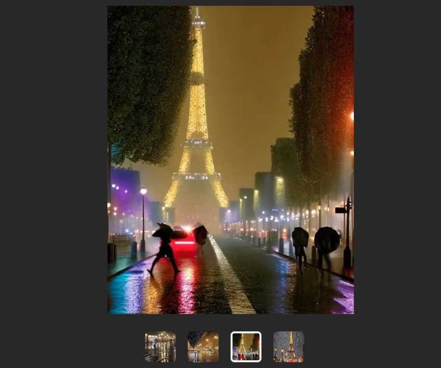 Выставив подходящие параметры, остается лишь найти текстовое поле Your text prompt и ввести предложение или набор слов, способных расшифровать будущую иллюстрацию. Редакция блога Сергея Смирнова, например, попыталась изобразить с помощью алгоритма DALL-E 2 оживленный Париж темной ночью, да еще и под дождем.