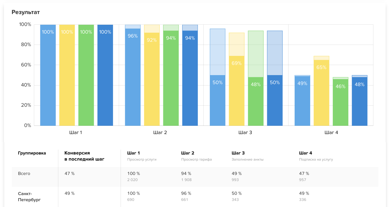 Интерфейс MyTracker позволяет работать с преднастроенными дашбордами или создавать свои собственные детализированные отчеты по всем платформам и проектам. Также здесь можно гибко настраивать сегменты аудитории и выгружать их в другие системы аналитики для создания кастомных отчетов. Еще MyTracker позволяет создавать воронки для анализа пользовательского пути — безлимитные, глубокие, с графиками и гибкой разметкой кастомных событий.